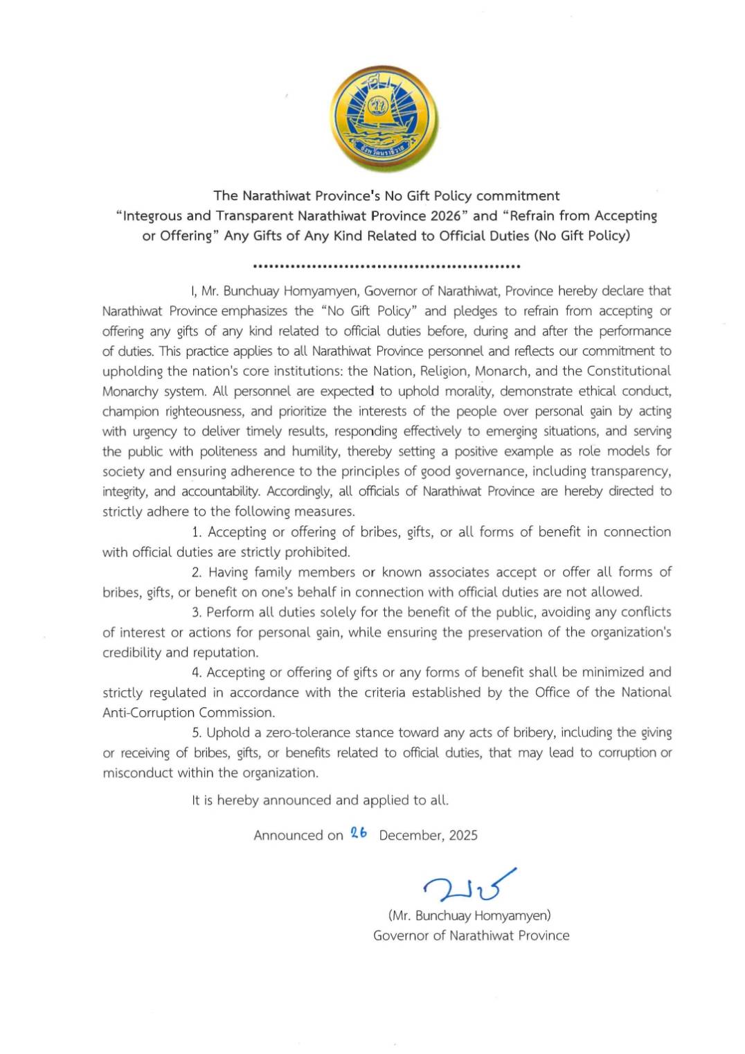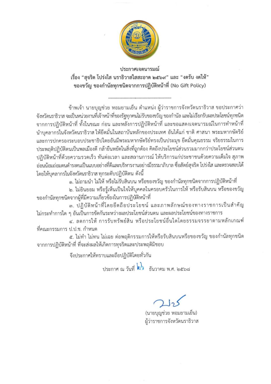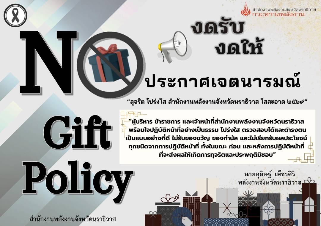 “ผู้บริหาร ข้าราชการ และเจ้าหน้าที่สำนักงานพลังงานจังหวัดนราธิวาส พร้อมใจปฏิบัติหน้าที่อย่างเป็นธรรม โปร่งใส ตรวจสอบได้และดำรงตน เป็นแบบอย่างที่ดี ไม่รับของขวัญ ของกำนัล และไม่เรียกรับผลประโยชน์ ทุกชนิดจากการปฏิบัติหน้าที่ ทั้งในขณะ ก่อน และหลังการปฏิบัติหน้าที่ ที่จะส่งผลให้เกิดการทุจริตและประพฤติมิชอบ”